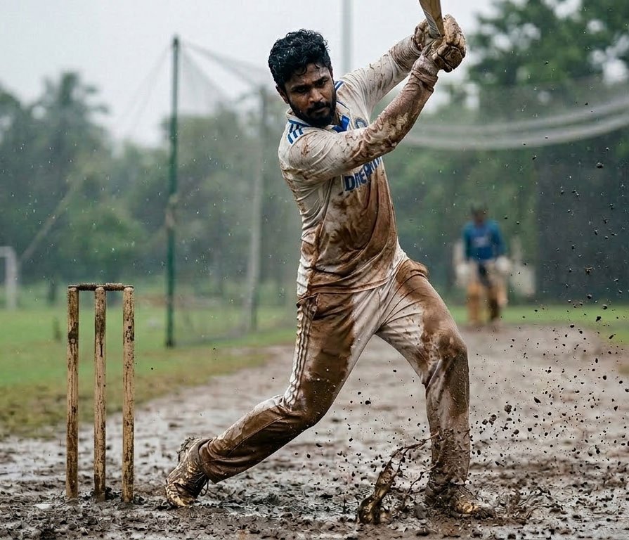 തിരുവനന്തപുരത്തെ വിജനമായ, ചെളി നിറഞ്ഞ ഒരു ഗ്രൗണ്ട്. പേമാരി പെയ്യുന്നു—എല്ലാം സ്തംഭിപ്പിക്കുന്ന കേരളത്തിലെ കർക്കിടക മൺസൂൺ. പക്ഷേ അവൻ മാത്രം നിർത്തിയില്ല.