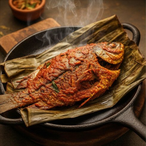 വാഴയിലയിൽ പൊതിഞ്ഞ് ചുട്ടെടുത്ത കരിമീൻ.