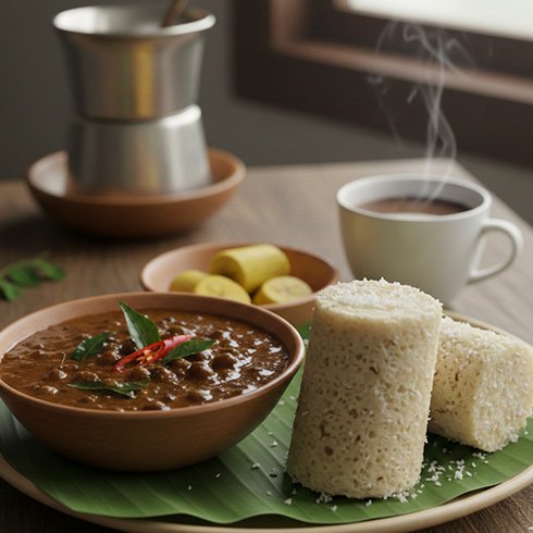 മലയാളികളുടെ ഏറ്റവും പ്രിയപ്പെട്ട പ്രഭാതഭക്ഷണം. തയ്യാറാക്കുന്ന വിധം: 1. പുട്ട്: അരിപ്പൊടിയിൽ അല്പം ഉപ്പും വെള്ളവും ചേർത്ത് നനയ്ക്കുക (നനവ് അധികമാകരുത്). പുട്ടുകുറ്റിയിൽ തേങ്ങ ചിരവിയതും അരിപ്പൊടിയും ലെയറുകളായി ഇട്ട് 5 മിനിറ്റ് ആവിയിൽ വേവിച്ചെടുക്കുക.